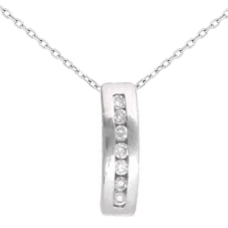 0.12 cts. Gargantilla Oro blanco 18 kts. 7 diamantes talla brillante de 1.50mm. Calidad H-VS/SI. Motivo 14x4 mm. Cadena Forzada de 42-45 cm de largo con doble asa