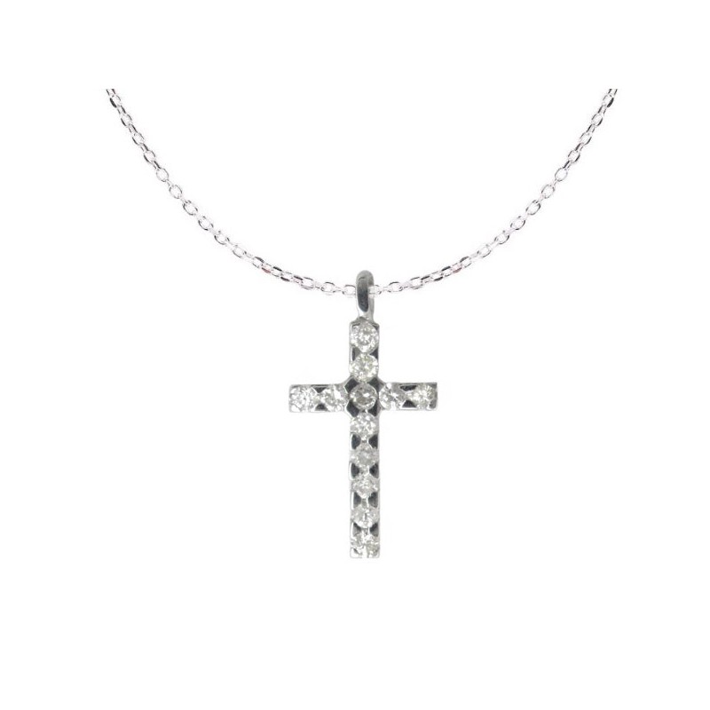 0.12 cts. Gargantilla Cruz Oro Blanco 18 kts. 12 Diamantes talla brillante de 1.20 mm. Calidad H-VS/SI. Cadena Forzada de 0.25. 42-45 cm de largo con doble asa. Motivo 13x7