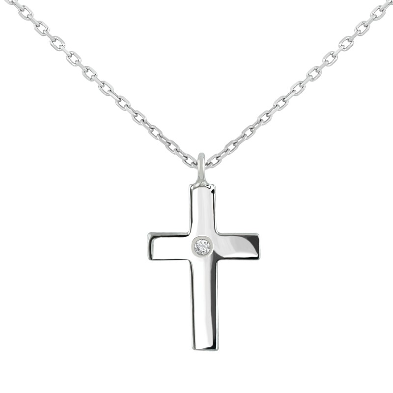 0.008 cts. Gargantilla Oro Blanco 18 kts. Motivo cruz 12 x 9 mm. 1 diamante talla brillante de 1.10 mm. Calidad H-VS/SI. Cadena forzada de 0.25 a 39-42 cm.