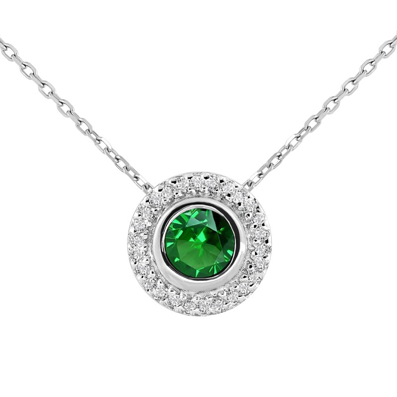 0.052 cts. Gargantilla Oro Blanco 18 kts. 1 esmeralda de 4 mm (0.28 cts.) y 26 diamante talla brillante de 0.80 mm. Calidad H-VS/SI. Motivo 8.5 mm. Cadena forzada con doble asa a 42-45 cm de largo.