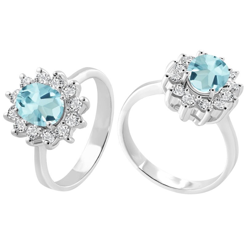 0.54 cts. Sortija Oro blanco 18 kts. 1 Agua Marina talla oval de 8x6 (1.25 cts.) y 12 diamantes talla brillante de 2.20 mm. Calidad H-VS/SI