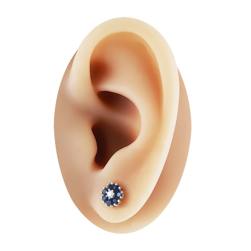 0.08 cts. Pendientes Oro blanco 18 kts. 14 zafiros talla brillante 1.90mm (0.52 cts.) y 2 diamantes talla brillante 2.10mm. Calidad H-VS/SI. Roseta 7mm