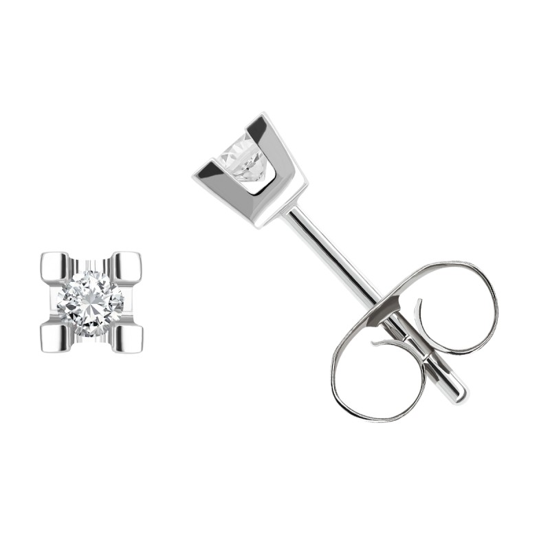 0.16 cts. Pendientes 4 garras cuadradas Oro blanco 18 kts. 2 diamantes talla brillante de 2.70mm. Calidad H-VS/SI