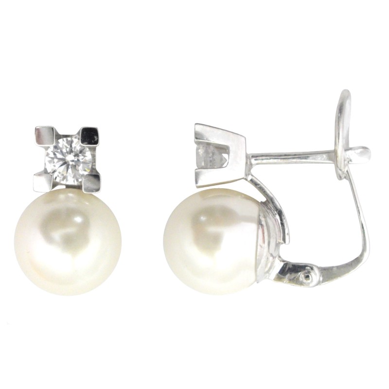 0.16 cts. Pendientes Oro blanco 18 kts. Perlas cultivadas 8-8,5mm y 2 diamantes talla brillante de 2.70mm. Calidad H-VS/SI