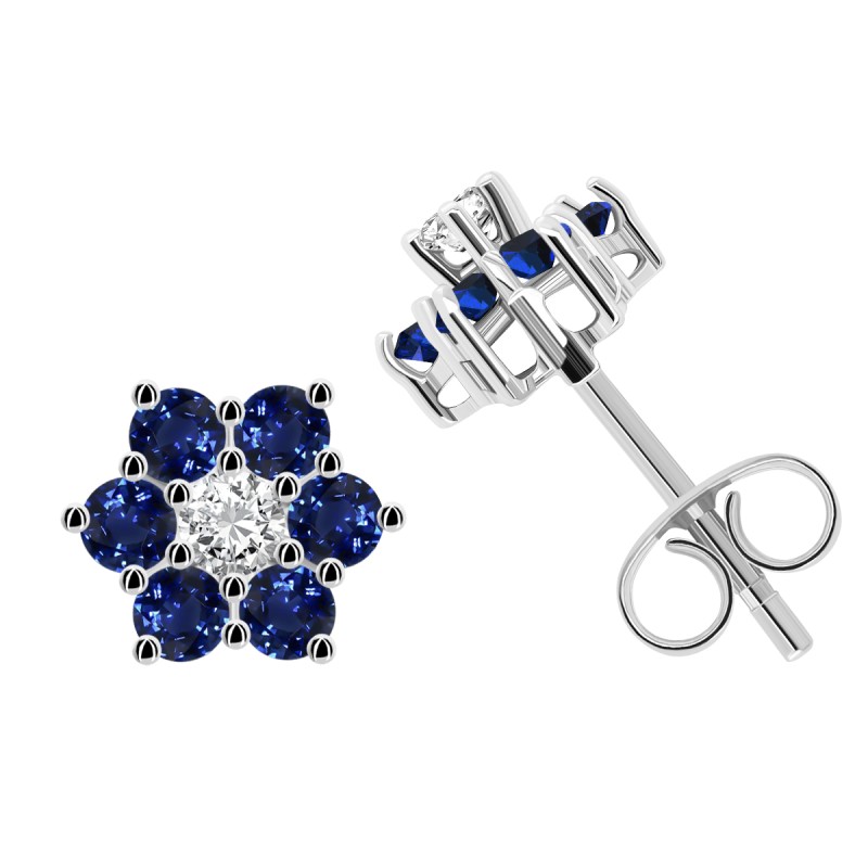 0.16 cts. Pendientes Oro Blanco 18 kts. 12 zafiros talla brillante de 2.50 mm (0.84 cts.) y 2 diamantes talla brillante de 2.70 mm. Calidad H-VS/SI. Roseta 7-8 mm