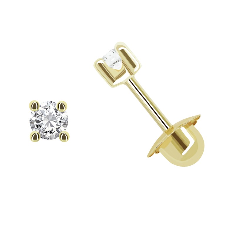 0.07 cts. Par pendientes 4 garras Oro Amarillo 18 kts. 2 diamantes talla brillante de 2.00 mm. Calidad H-VS/SI. Cierre tuerca.