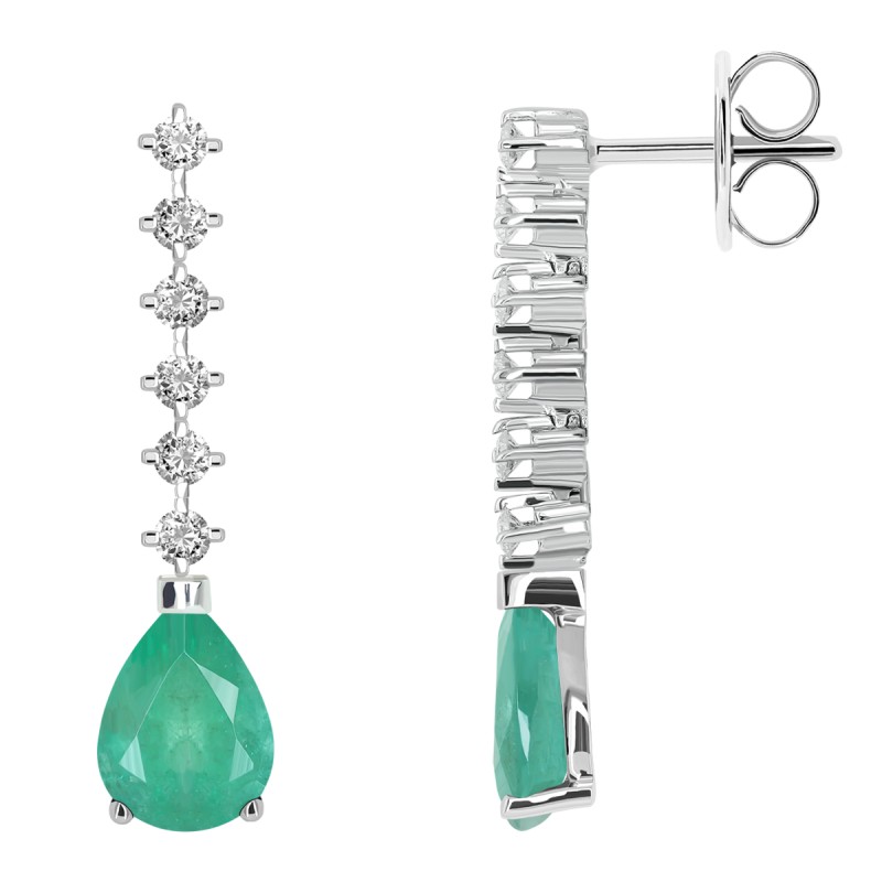 0.30 cts. Pendientes Oro Blanco 18 kts. 12 diamantes talla brillante de 1.80 mm. Calidad H-VS/SI. 2 esmeraldas talla pera de 8x6 mm.(1.66 cts). 26 mm de largo aprox. Presión con volante.