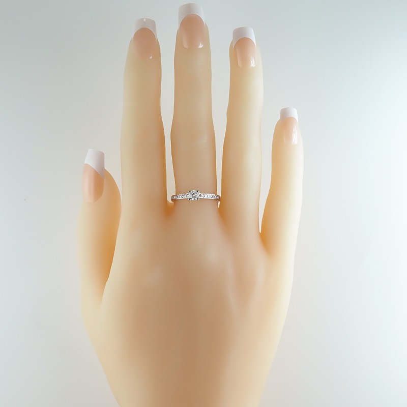 0.43 cts. Sortija Oro Blanco 18 Kts. 1 diamante talla brillante de 4 mm y 18 diamantes talla brillante de 1.30 mm. Calidad H-VS/SI