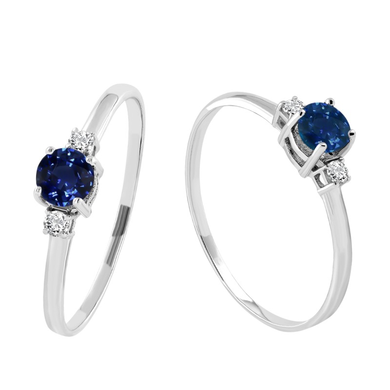 0.04 cts. Sortija Oro Blanco 18 kts. 2 diamantes talla brillante de 1.70 mm y 1 zafiro talla brillante de 4 mm (0.30 cts.). Calidad H-VS/SI.
