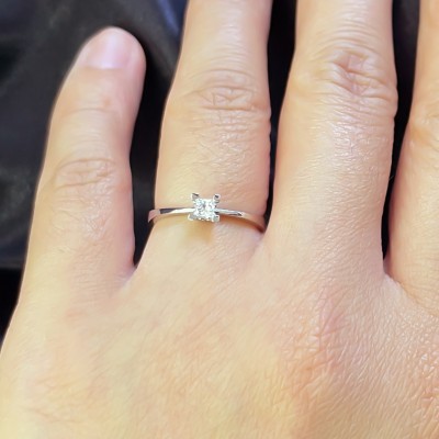 0.14 cts. Sortija Oro blanco 4 garras cuadradas 18 kts. 1 diamante talla Princesa de 2.75 x 2.75 mm. Calidad H-VS. El motivo mide 4.5 x 4.5 mm aprox.
