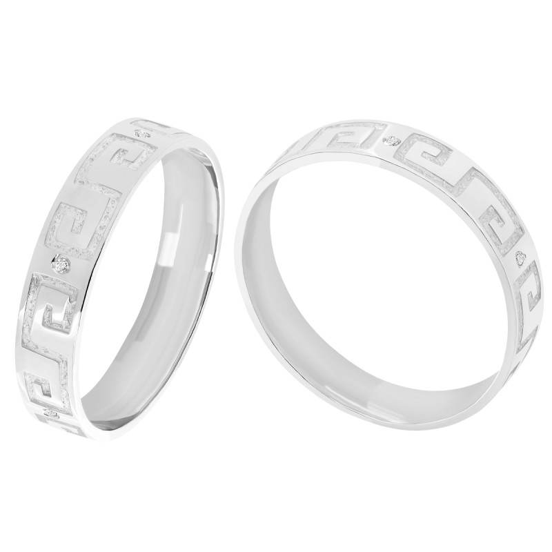 0.024 cts. Sortija Oro Blanco 18 kts. 3 Diamantes talla brillante de 1.10 mm. Calidad H-VS/SI. Motivos con interiores satinados. Mide 5 mm de ancho aprox.